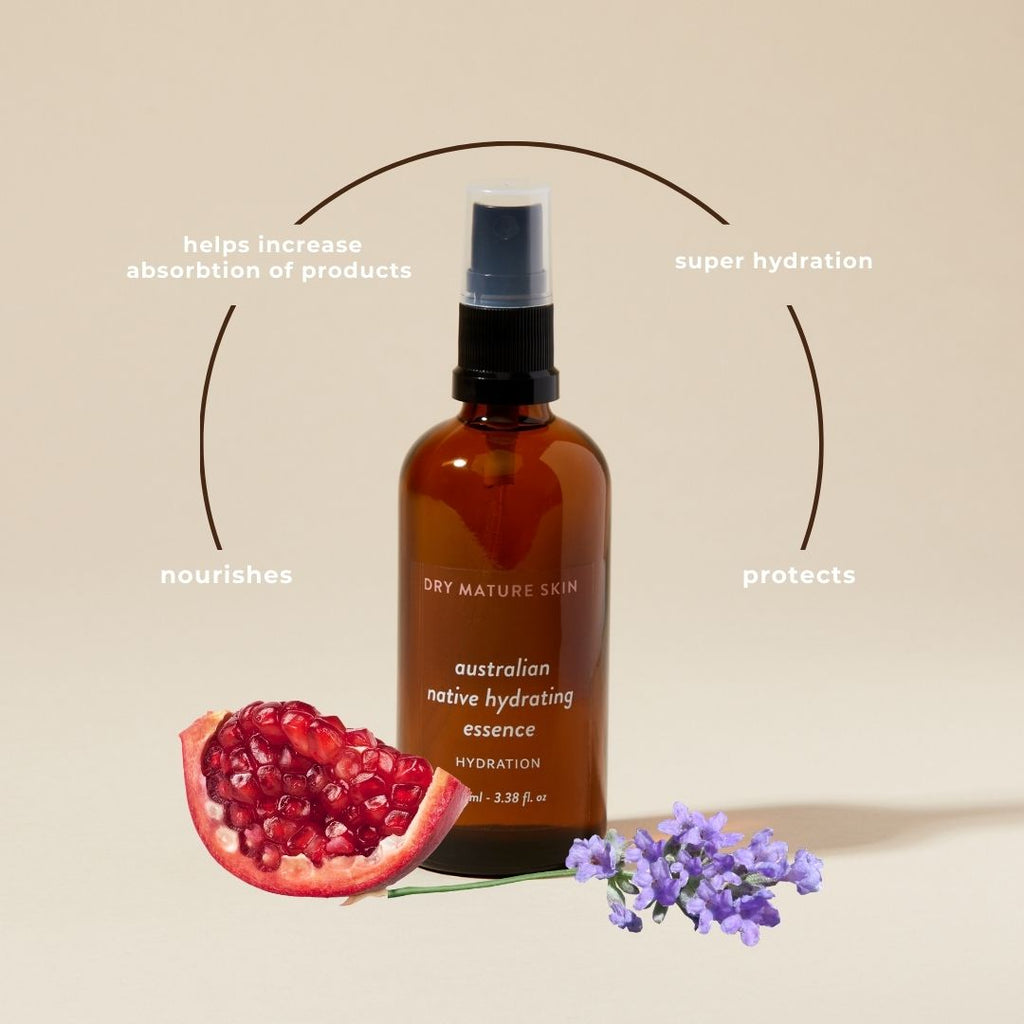 Australian Native Hydrating Essence - An array of hydrating plant actives including B5 and Pomegranate Extract to open up the water channels of the skin effectively supply the needed vitamins and minerals the skin needs to return to its normal state.